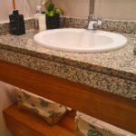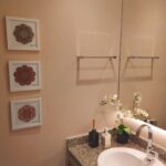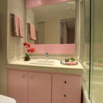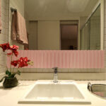 Descrição: Um banheiro simples pode se tornar elegante com poucos detalhes, como troca metais e cuba para trazer modernidade ao ambiente. Aplicamos moldura ripados rosa na parte superior e inferior do espelho e laqueamos o armário que já existia. Com isso conseguimos agradar a nossa jovem cliente.