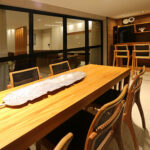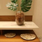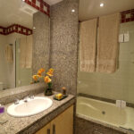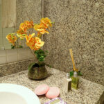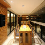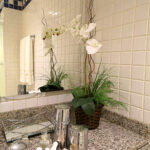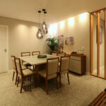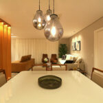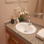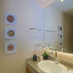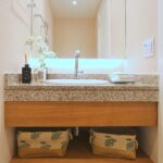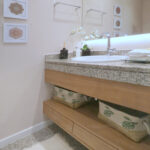 Descrição: Para trazer personalidade neste lavabo trabalhamos com algumas estratégias certeiras. Mantivemos a bancada e a cuba, trocando apenas os metais. Já embaixo da bancada mudamos a proposta: tiramos o armário antigo e colocamos um gaveteiro em madeira Freijó, isso porque, além de deixar o ambiente leve, ainda mantém sua função, não perdendo a utilidade. Os revestimos das paredes foram pensados de forma a não pesar o local, já que o granito da bancada chama atenção. Então a composição foi feita em tons neutros, com um lindo papel de parede estilo couro de cobra e quadros. Para finalizar e ampliar o lavabo trouxemos um espelho com iluminação embutida.
