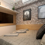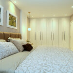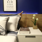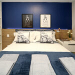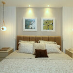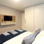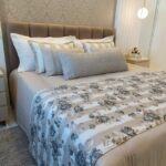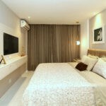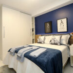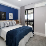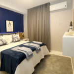 Descrição: A proposta desse quarto foi trazer a brisa do mar para seu interior, pois o mesmo tem uma vista deslumbrante para a praia. Com vários tons de azul, na parede e nos adornos fazendo contraste com o material laminado branco e amadeirado. Sendo assim, temos um ambiente agradável e aconchegante.