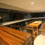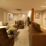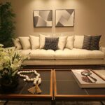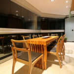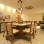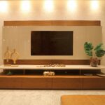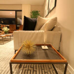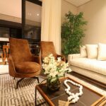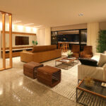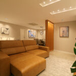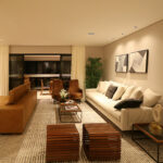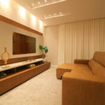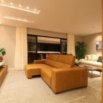 Nesta Sala de Estar temos um lindo painel de TV com iluminação de LED, um sofá de couro ajustável para poder se deitar enquanto assiste a um programa. No segundo ambiente colocamos um outro sofá off-White mais composição de poltronas e banquetas para receber as visitas. O tapete escolhido compõe toda área principal do estar. Os quadros acima do sofá branco, combinam com as almofadas pretas, visto que suas composições são similares. Os arranjos florais neste trabalho fazem a diferença na ambientação.