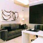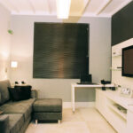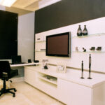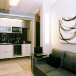 Espaço projetado para atender um jovem executivo que vive no Rio de Janeiro e trabalha em uma empresa multinacional, viajando frequentemente a trabalho. O ambiente, com apenas 13.80m², foi concebido para ser prático e atender diversas necessidades do rapaz, incluindo estar, escritório, sala de TV, jantar e cozinha. No estar, há um sofá em chenille grafite que se transforma em divã com o apoio de um puff, além de uma mesinha com rodízio e luminária de parede. Acima do sofá, há uma tela de arte e uma prateleira para livros e objetos decorativos. O escritório é criado com uma mesa deslizante sobre um rack, que também serve como apoio para jantar. A cozinha compacta possui bancada, fogão, coifa, microondas e frigobar, tudo em um nicho fechado por portas de vidro espelhado. O mobiliário é de madeira de reflorestamento na cor branca, com piso artesanal fabricado em duas texturas. A versatilidade do espaço permite receber até 6 convidados confortavelmente para assistir filmes ou conversar.